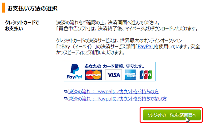 3. 決済画面の「支払方法」へ、Paypal へご登録いただいた「クレジットカード情報」が表示されます。