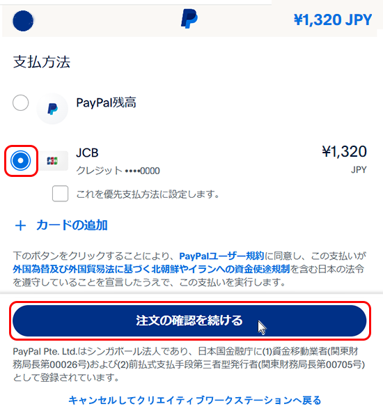 4. クレジットカードを選択して、「注文の確認を続ける」をクリックいただくと、決済が実行されます。