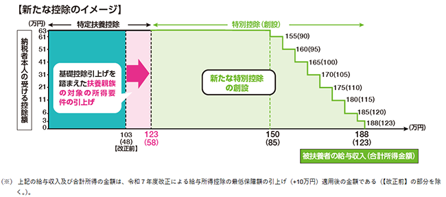 ※金額は、<給与所得控除 65万円+基礎控除 58万円>の合計額。 - 扶養控除: 扶養親族の合計所得金額要件を58万円以下に引き上げ(改正前 48万円以下)。
